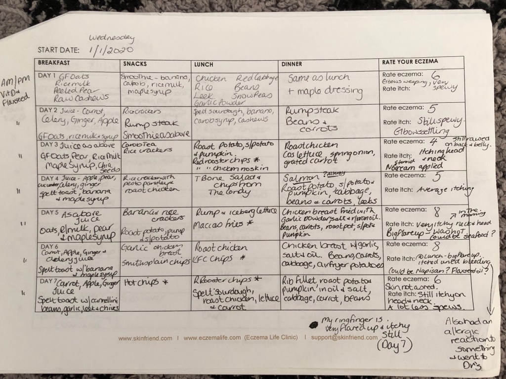 I kept a daily food diary of what I was eating and how Ollie’s eczema was progressing. I used the template off the Eczema Life website but if you’re more techy you could totally record it on your phone. As Ollie was exclusively breastfed this was the only way I could control his food, through me and what I ate. Some examples of my food diaries are below (and yes I have an obsession with hot chips!!). These are great to keep and look back on when you feel like there’s nothing to eat and as a good reminder of those great days where you ate well and made a difference.